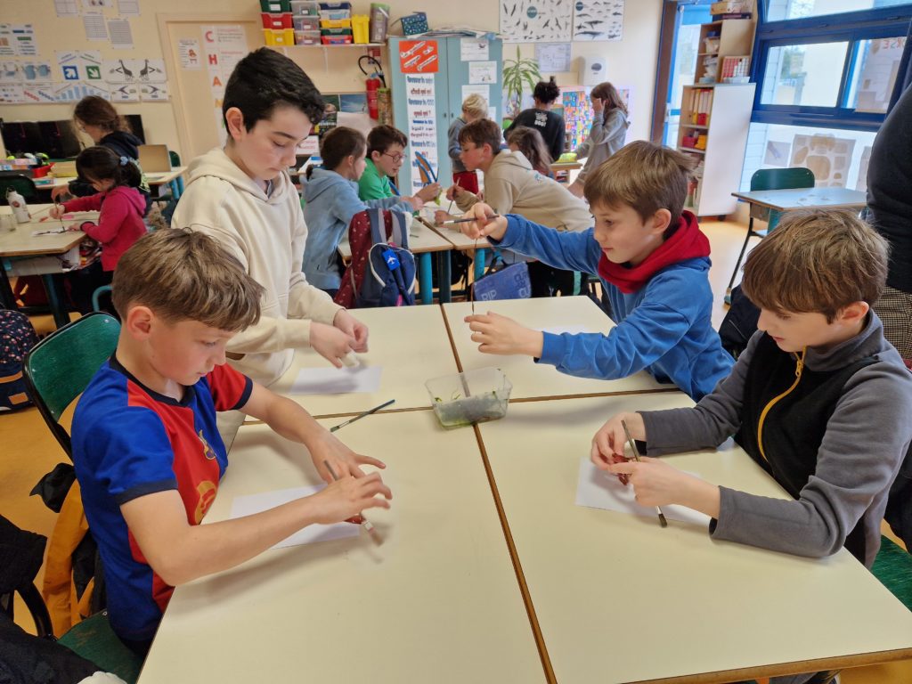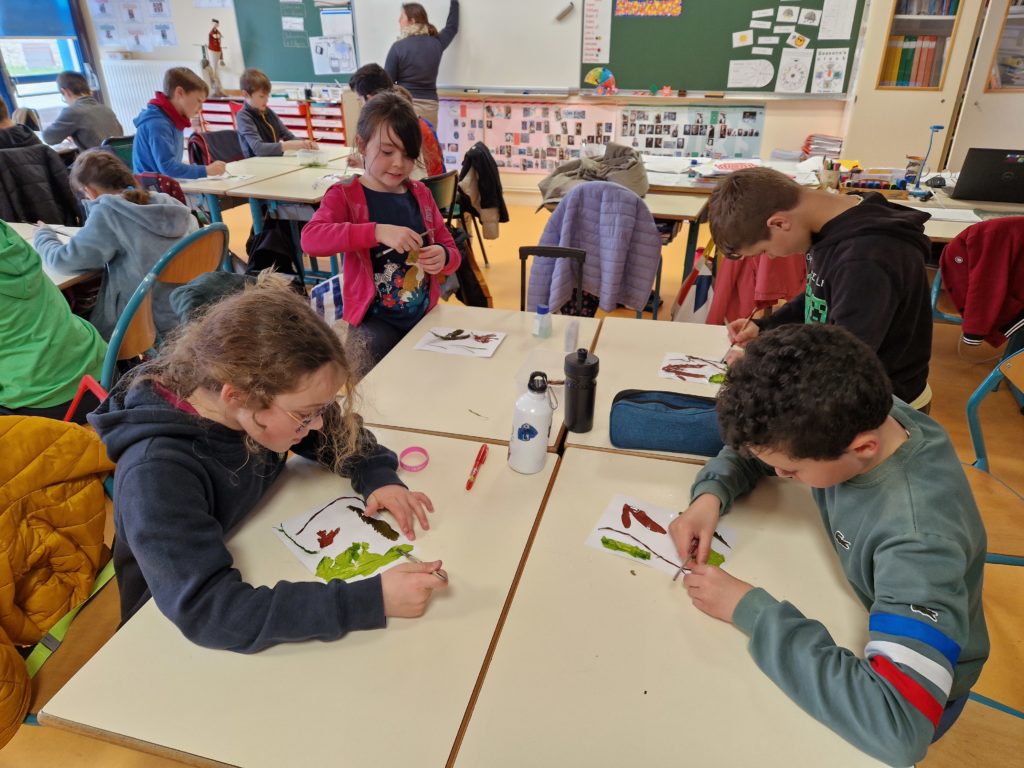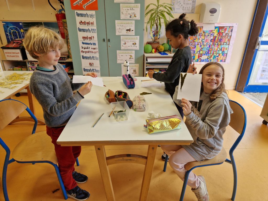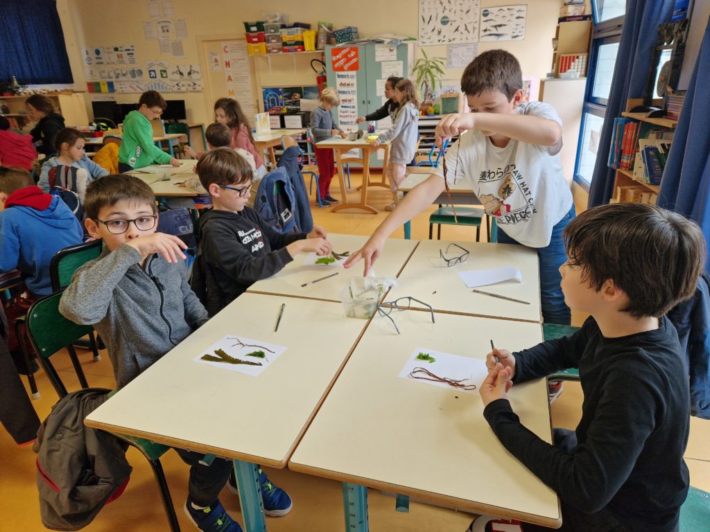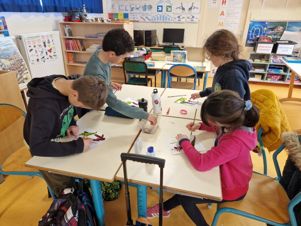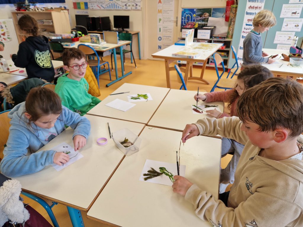 Après notre sortie sur l’estran, de retour en classe, chaque enfant s’est constitué son alguier en arrangeant le plus artistiquement possible différentes algues (vertes – brunes – rouges) sur une feuille de papier.