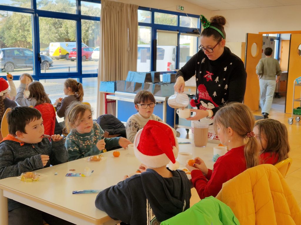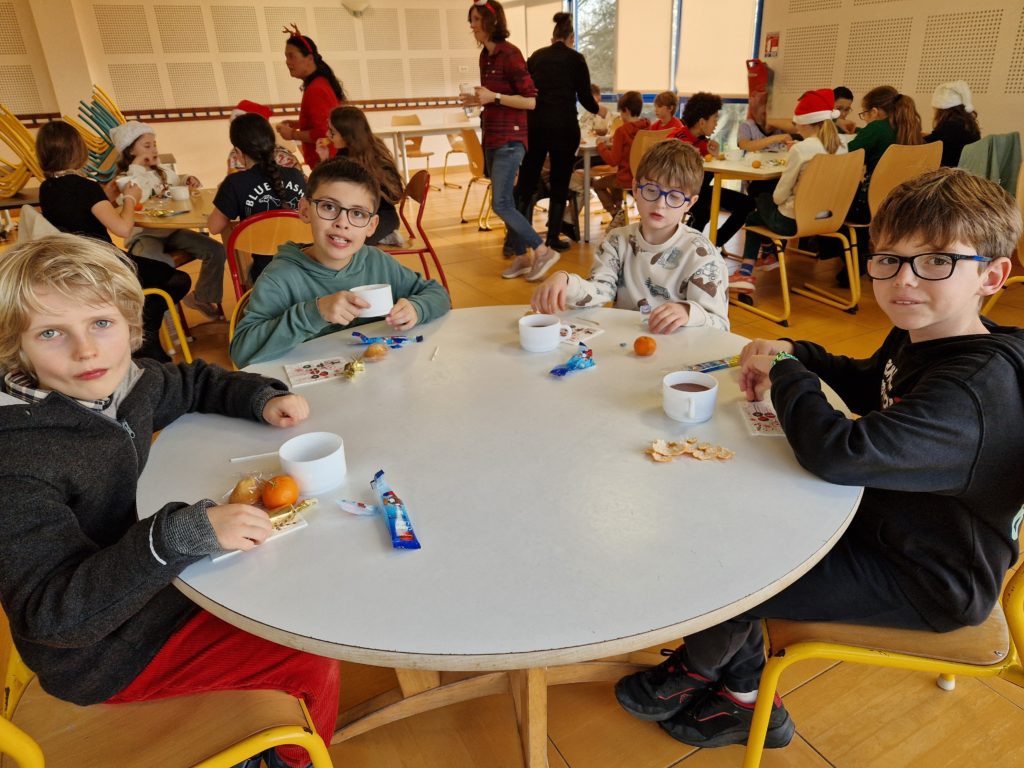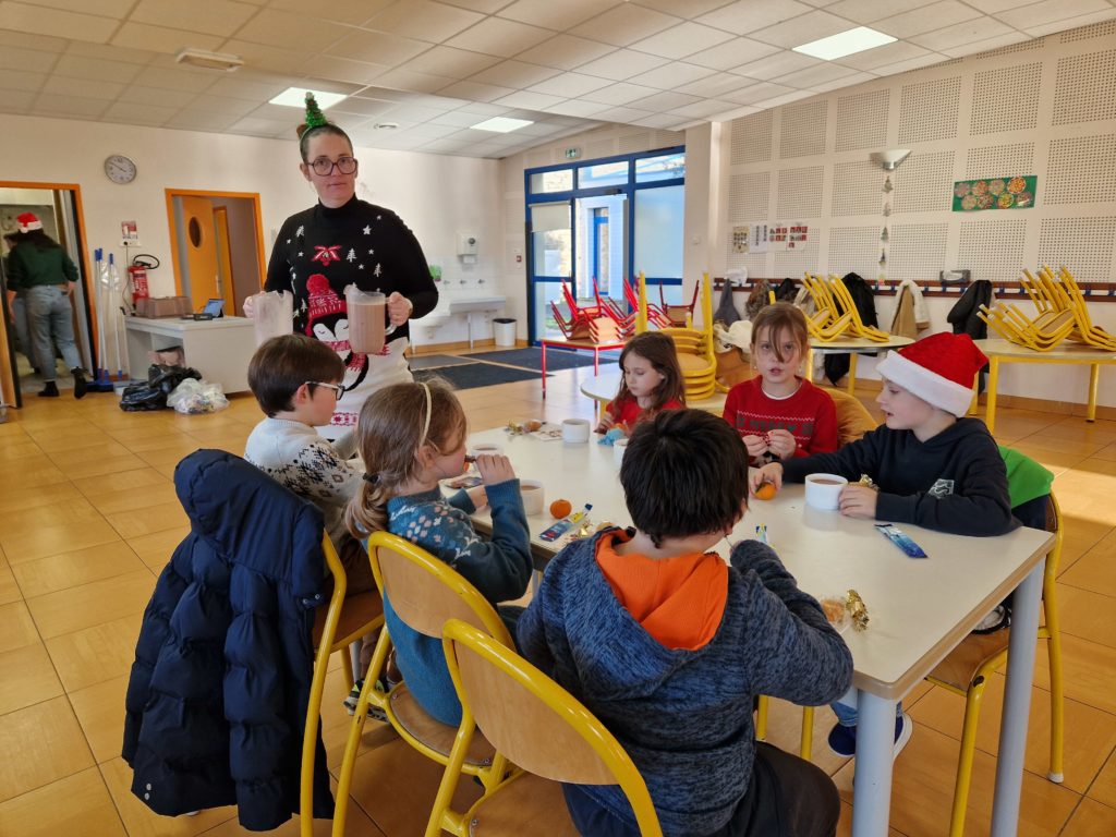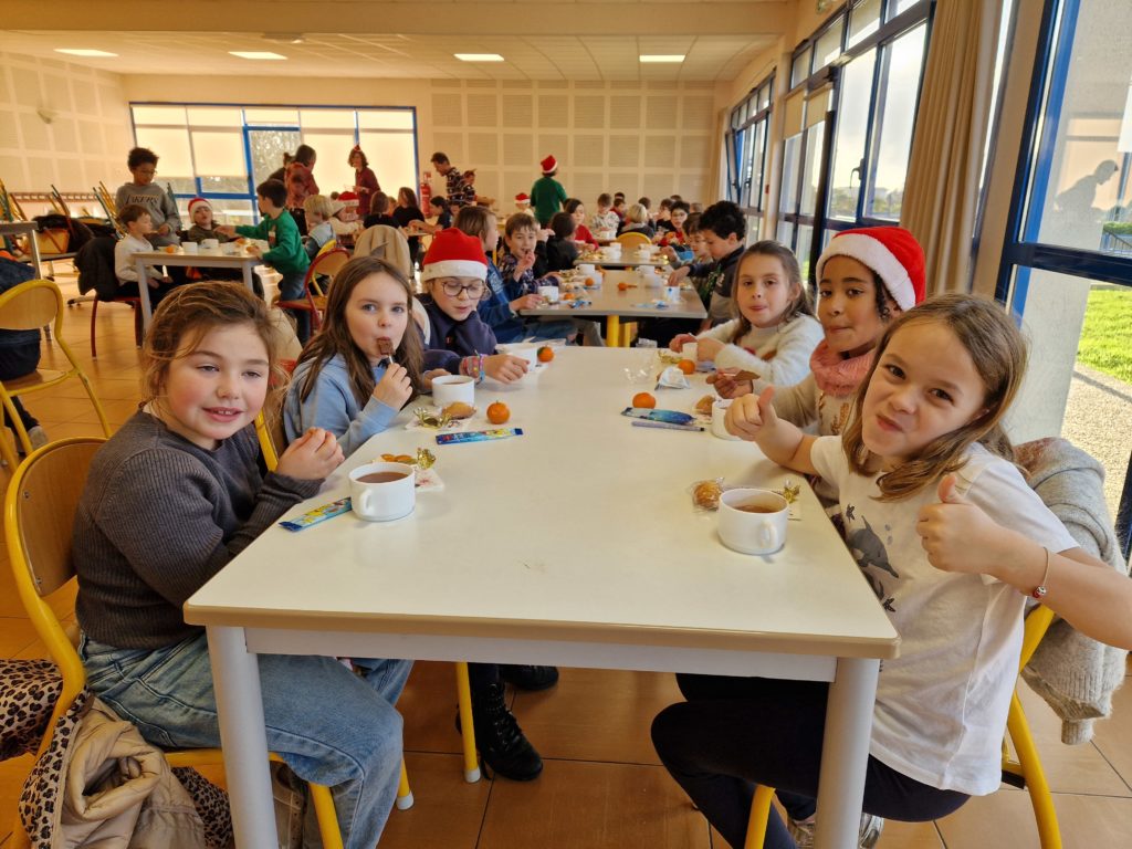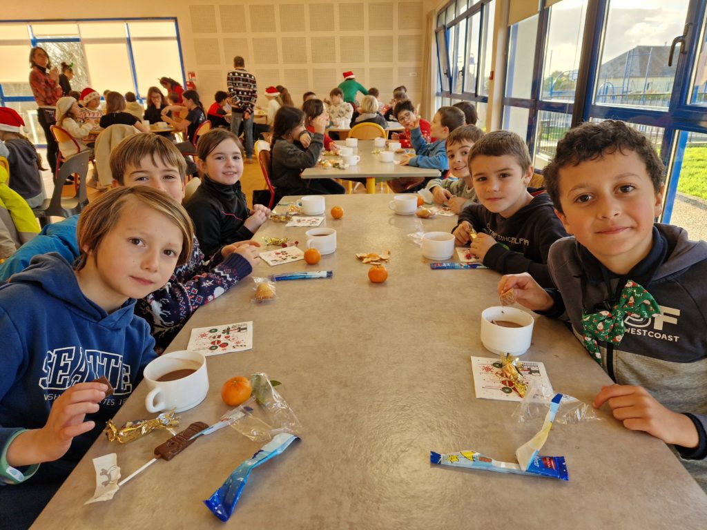Après la distribution de bonbons par le Père Noël, les élèves se sont régalés avec leur chocolat chaud, leur clémentine et leur madeleine, le tout offert et préparé par l’APE.