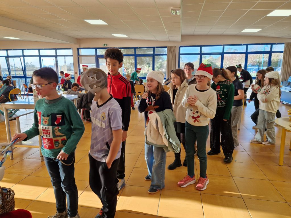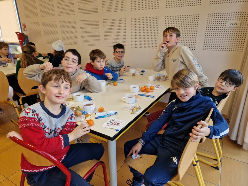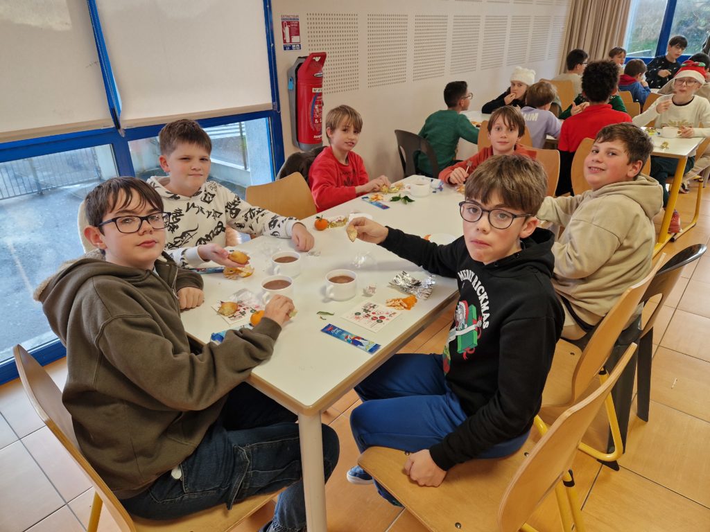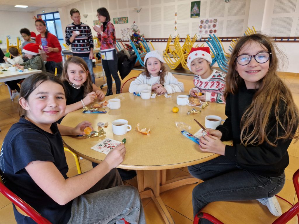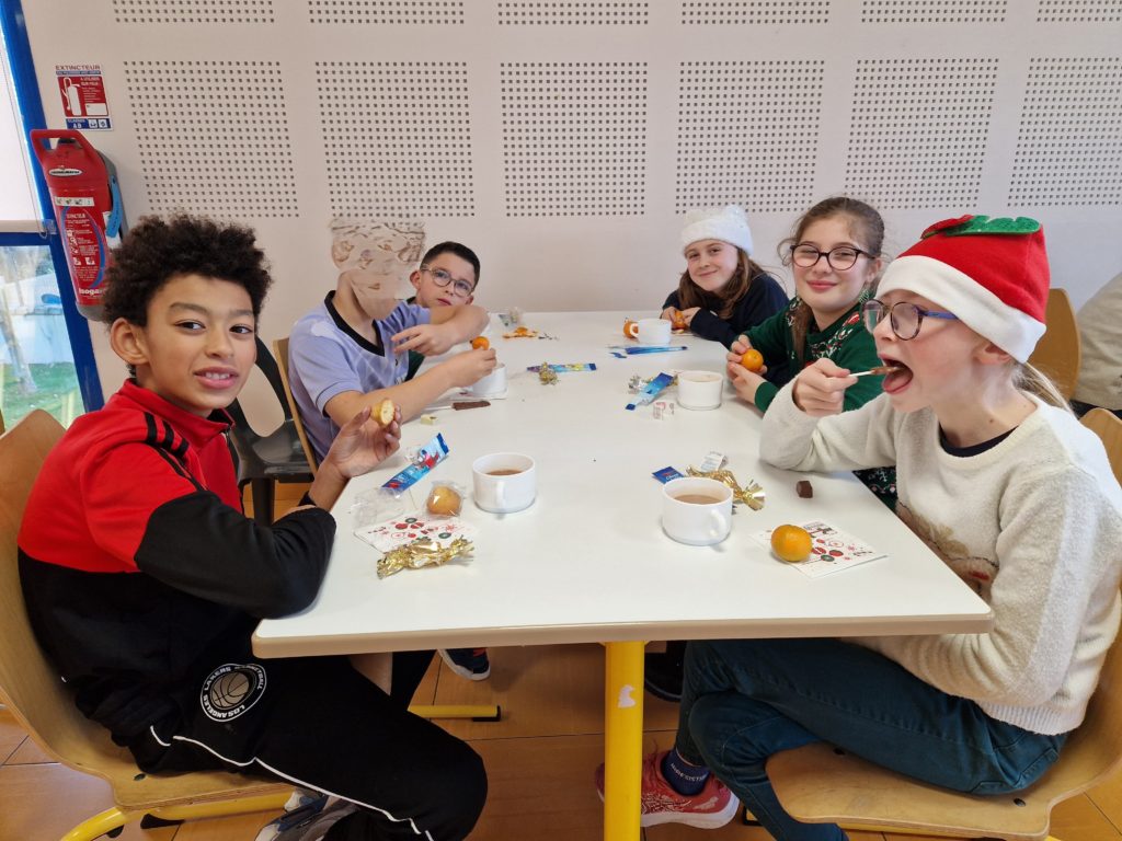 Après la distribution de bonbons par le Père Noël, les élèves se sont régalés avec leur chocolat chaud, leur clémentine et leur madeleine, le tout offert et préparé par l’APE.